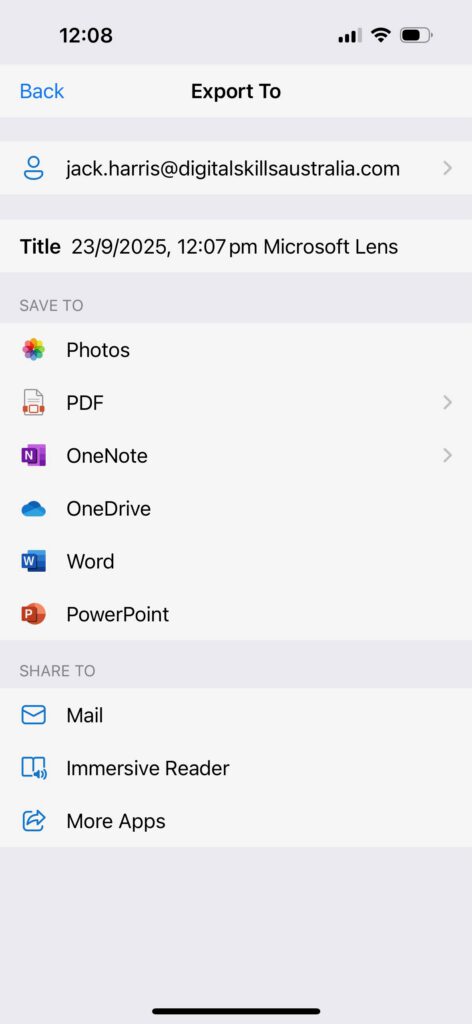1. Microsoft Lens will now drop us into the export page. Here we will need to pick how we wish to export the scan. In our case here I’ll select PDF as I want this document to come out as a file PDF with multiple pages.