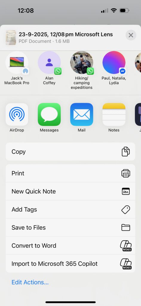 1. Finally we can do whatever we need to do with the document, in this case ill select “mail” to email it to my laptop. However you can send it via text, whats app, facebook or share the scanned PDF anyway you need. It’s that simple!